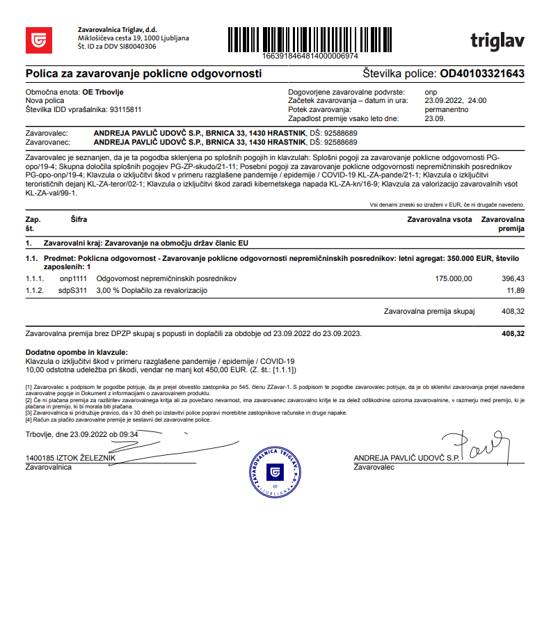 Nepremičninska družba ima zavarovano poklicno odgovornost za škodo. Zavarovanje krije odgovornost za škodo, ki bi utegnila nastati naročitelju ali tretji osebi s kršitvijo pogodbe o posredovanju v prometu z nepremičninami na ozemlju Republike Slovenije. Naziv zavarovalnice, številka zavarovalne police ter zavarovalna vsota so navedeni v pogodbi o posredovanju.